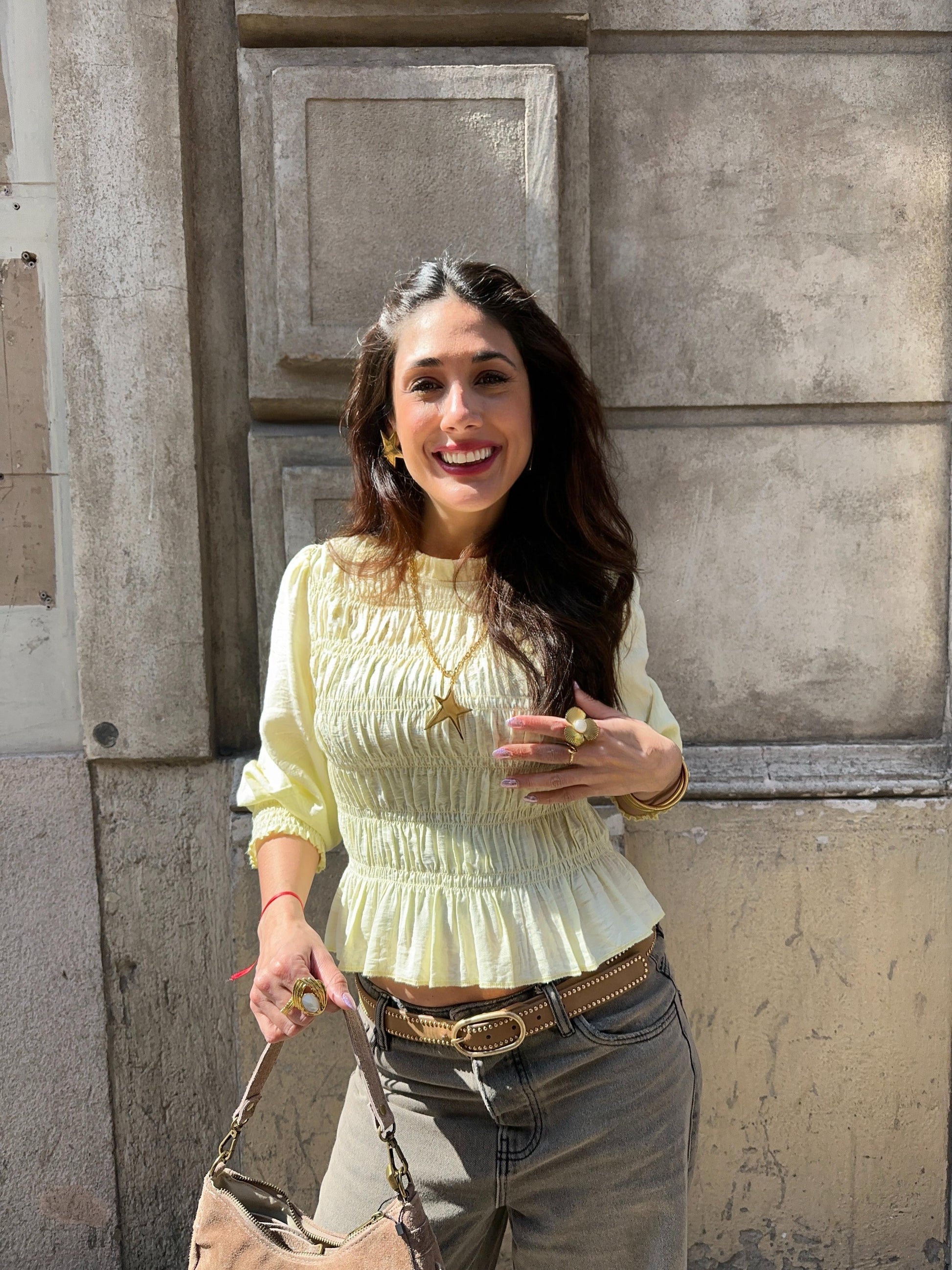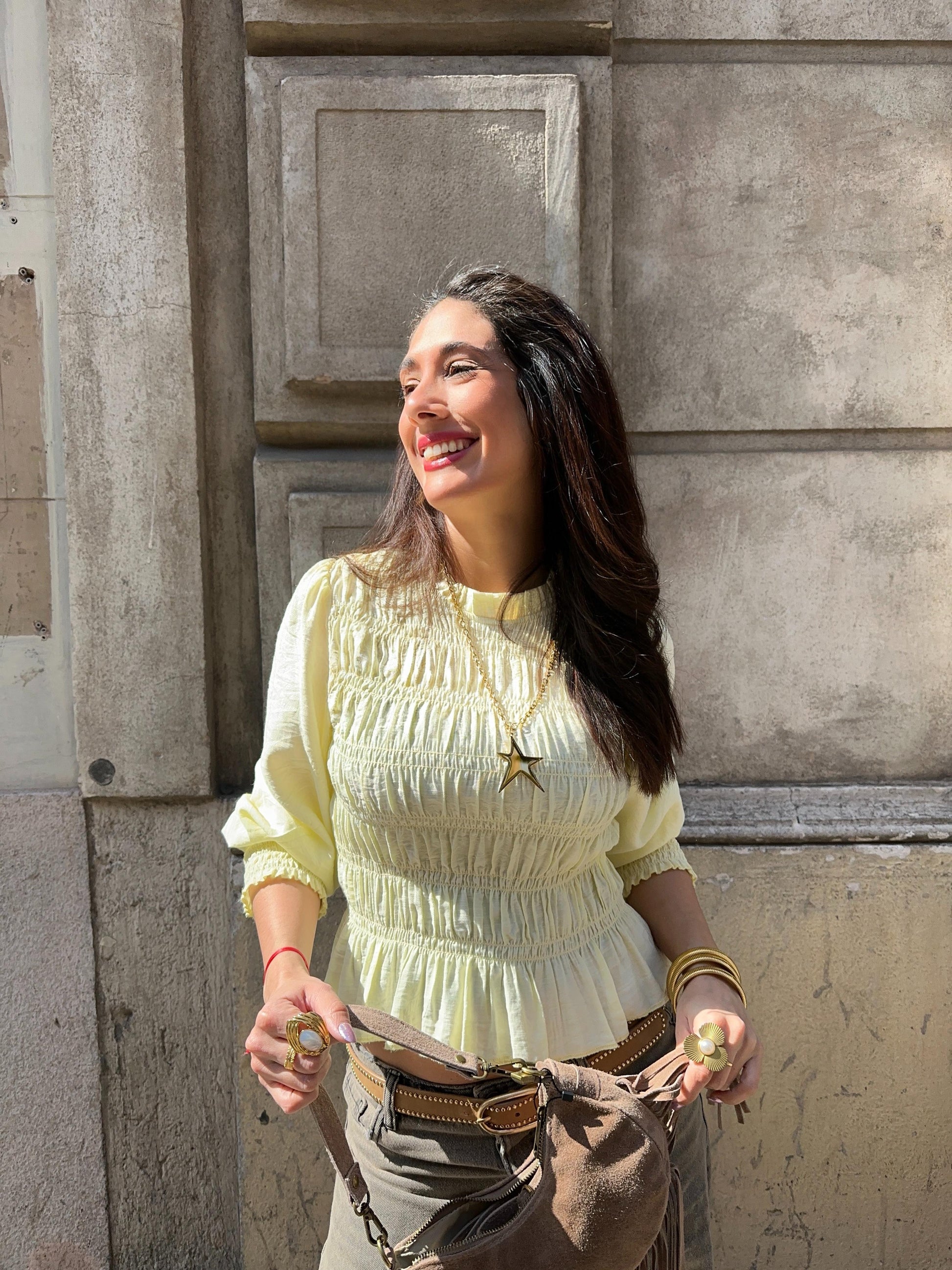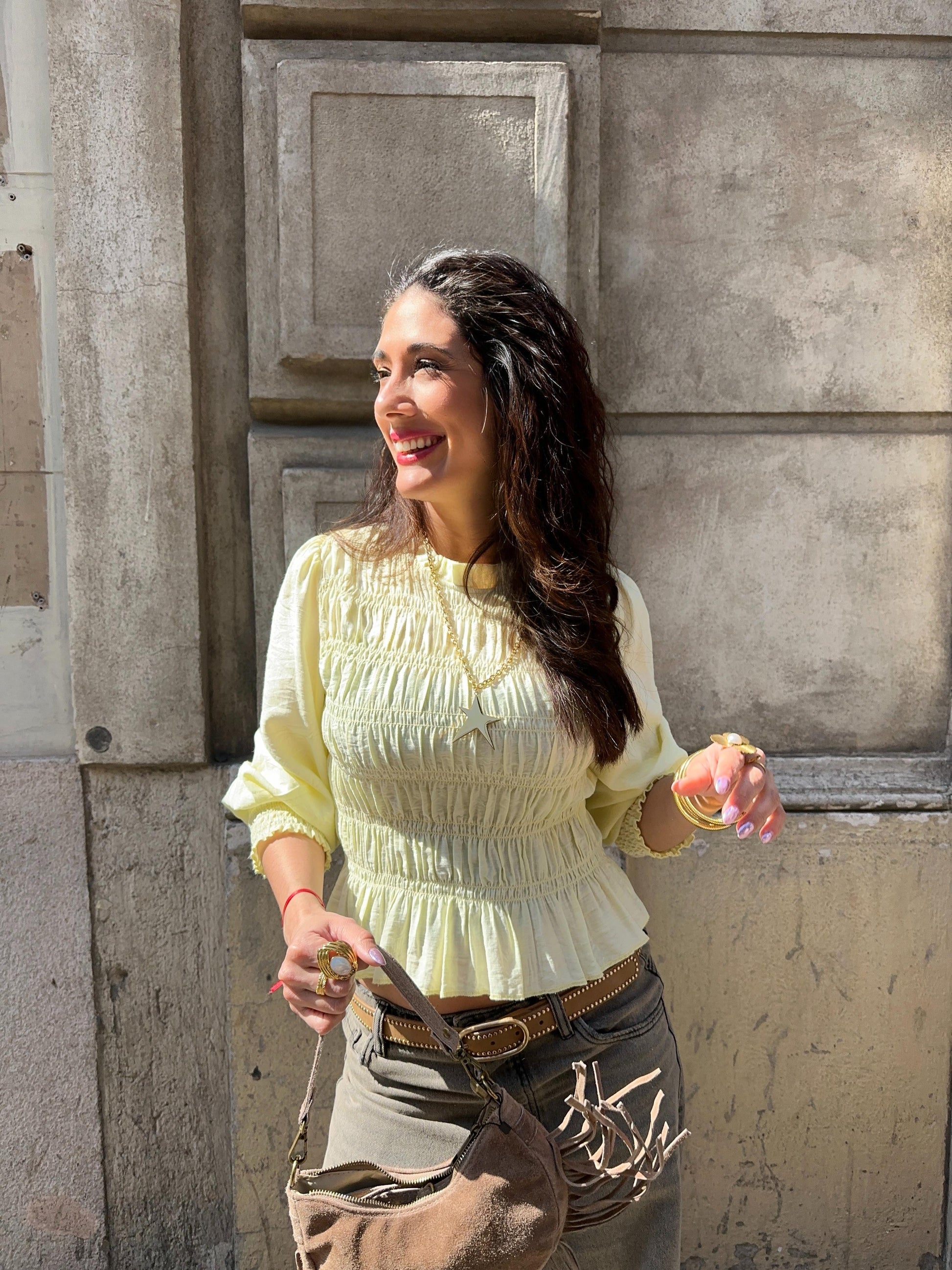 Camisa cuello U, con frunces, manga larga